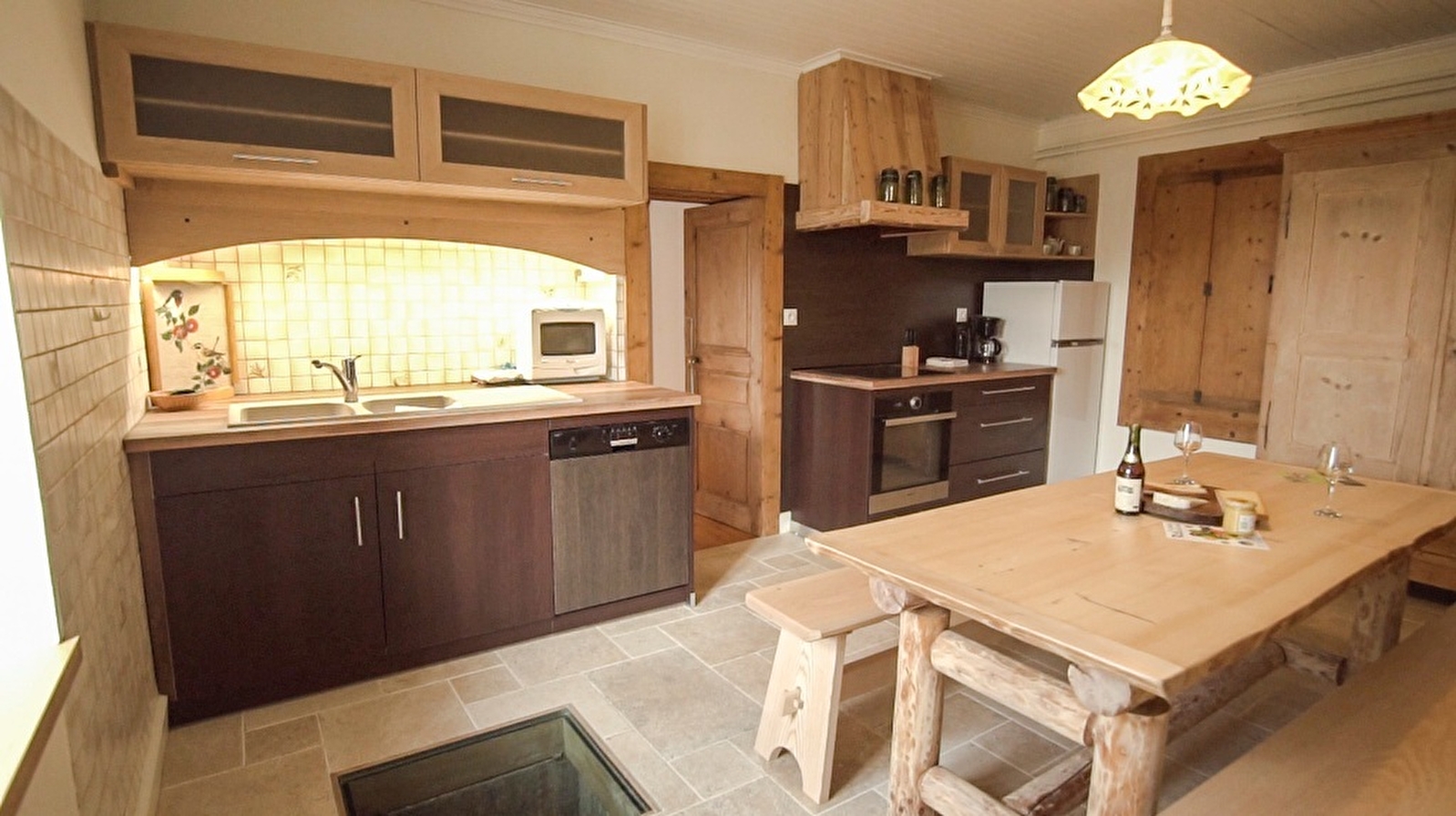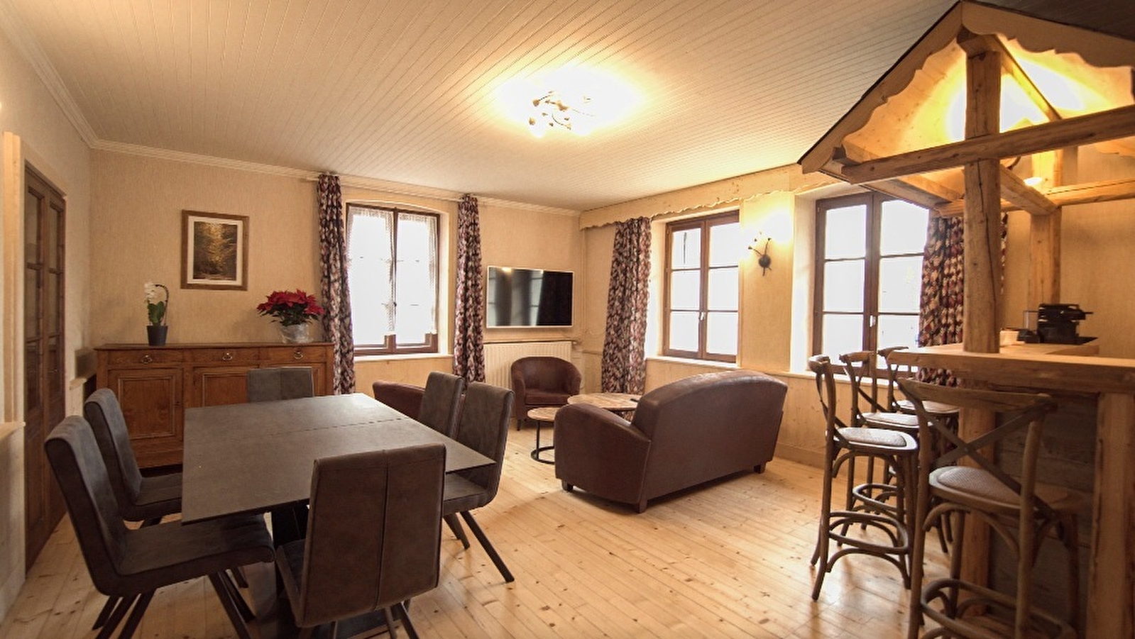 Aménagé dans une ancienne auberge, ce gîte (mitoyen) au propriétaire, situé au cœur du village de La Pesse, vous fera découvrir l'esprit de l'habitat Haut-Jurassien conjuguant, bois et pierre calcaire de construction. Au rez-de-chaussée, le hall d'entrée et le couloir vous conduiront à la cuisine entièrement équipée, où vous découvrirez par une trappe vitrée la cave souterraine de l'auberge. La salle à manger, superbe pièce lumineuse de 35 m² avec un espace salon avec écran plat et un bar jurassien. Une pièce détente et salle de jeux avec écran TV qui donne accès à une véranda aménagé coin presse et magazines avec accès sur terrasse et jardin privatif de 3000 m² de la maison. Par l'escalier central d'époque, vous accédez à l'étage pour découvrir 4 chambres uniques spacieuses et lumineuses et aménagées avec des essences de bois jurassiennes différentes. 1 suite parentale avec lit double 160 cm et offrant une salle de bain totalement équipée avec baignoire, et WC 1 chambre avec lit double 160 cm avec espace bureau pour le travail ou la lecture. 1 chambre équipée avec un lit 130 cm et un lit 90 cm. 1 dernière chambre avec un lit 90 cm. Au niveau sanitaire : Au RDC, un WC indépendant et une salle de bain avec vasque et grande douche à l'italienne A l'étage : une salle de bain avec vasque, baignoire et WC Un espace sauna et détente pour 4 personnes vous permettra de vous détendre après une ballade en raquette ou une randonnée. Côté extérieur, la maison bénéficie d'un parc privé entièrement fermé de 3000 m² avec terrasse aménagée et salon de jardin, jardins fleurs et potagers à disposition (L’aménagement d’un espace jeu enfant et d’un terrain de boules sont prévus pour 2023) Vous disposez également d'un garage fermé pour votre véhicule et d'une place de parking privé extérieure. Pour votre plus grand confort, les lits seront faits à votre arrivée et les serviettes de toilettes fournies. Forfait ménage obligatoire : 100€
