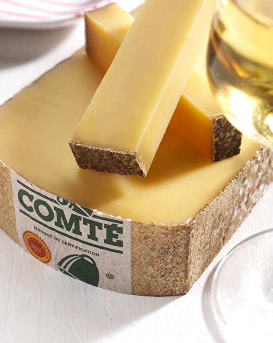 Produit uniquement sur le massif jurassien, le Comté est fabriqué à partir de lait cru de vaches « Montbéliarde » ou « Simmental », exclusivement nourries d'herbe et de foin. Un indispensable des belles tablées qui nécessite 400 litres de lait pour devenir une meule à pâte pressée cuite. C’est le fromage le plus vendu dans le monde avec 45 000 meules par an ! Ces meules d'environ 42 kilos font entre 55 et 75 cm de diamètre.