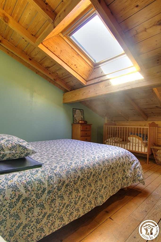 Au niveau de la grange : local pour le bois ainsi que pour vélos et skis. Entrée du gîte vers les chambres : 1 petite chambre double + une grande chambre pour 4 personnes avec dressing.