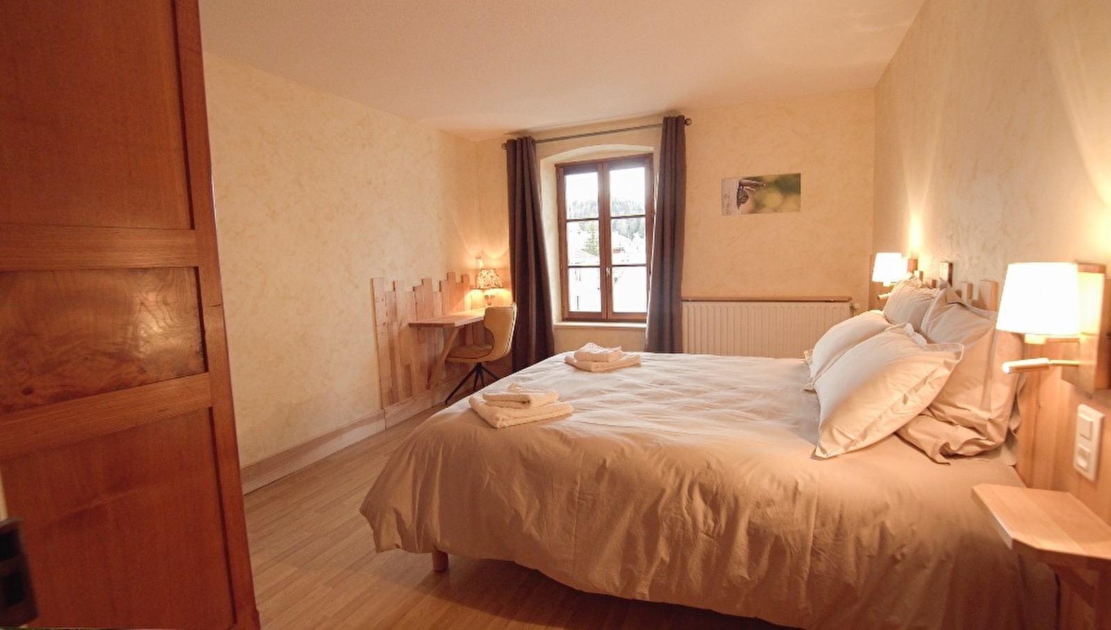 Aménagé dans une ancienne auberge, ce gîte (mitoyen) au propriétaire, situé au cœur du village de La Pesse, vous fera découvrir l'esprit de l'habitat Haut-Jurassien conjuguant, bois et pierre calcaire de construction. Au rez-de-chaussée, le hall d'entrée et le couloir vous conduiront à la cuisine entièrement équipée, où vous découvrirez par une trappe vitrée la cave souterraine de l'auberge. La salle à manger, superbe pièce lumineuse de 35 m² avec un espace salon avec écran plat et un bar jurassien. Une pièce détente et salle de jeux avec écran TV qui donne accès à une véranda aménagé coin presse et magazines avec accès sur terrasse et jardin privatif de 3000 m² de la maison. Par l'escalier central d'époque, vous accédez à l'étage pour découvrir 4 chambres uniques spacieuses et lumineuses et aménagées avec des essences de bois jurassiennes différentes. 1 suite parentale avec lit double 160 cm et offrant une salle de bain totalement équipée avec baignoire, et WC 1 chambre avec lit double 160 cm avec espace bureau pour le travail ou la lecture. 1 chambre équipée avec un lit 130 cm et un lit 90 cm. 1 dernière chambre avec un lit 90 cm. Au niveau sanitaire : Au RDC, un WC indépendant et une salle de bain avec vasque et grande douche à l'italienne A l'étage : une salle de bain avec vasque, baignoire et WC Un espace sauna et détente pour 4 personnes vous permettra de vous détendre après une ballade en raquette ou une randonnée. Côté extérieur, la maison bénéficie d'un parc privé entièrement fermé de 3000 m² avec terrasse aménagée et salon de jardin, jardins fleurs et potagers à disposition (L’aménagement d’un espace jeu enfant et d’un terrain de boules sont prévus pour 2023) Vous disposez également d'un garage fermé pour votre véhicule et d'une place de parking privé extérieure. Pour votre plus grand confort, les lits seront faits à votre arrivée et les serviettes de toilettes fournies. Forfait ménage obligatoire : 100€